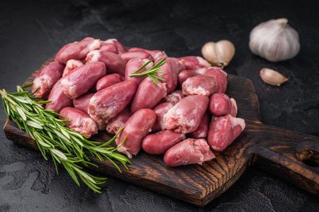 Raw chicken hearts with rosemary on dark wooden board and black stone background, fresh poultry offal ready for cooking