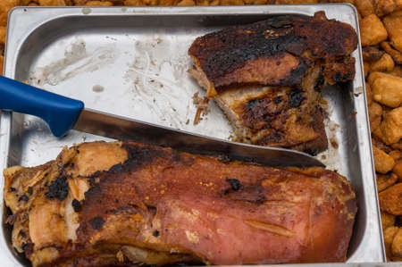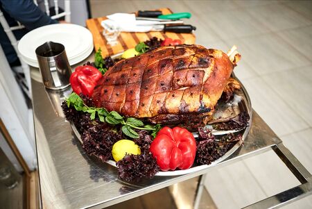 A big piece of roasted meat is ready to be served. Food for a big group of people