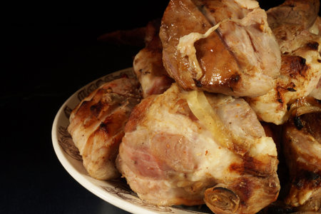 Roast sliced pork knuckle on a plate. Leg meat. Black background. Top view. Copy space.