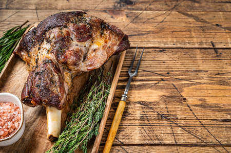 Roasted goat leg meat on a wooden cutting tray. wooden background. Top view. Copy space