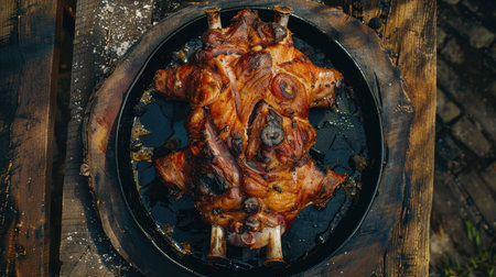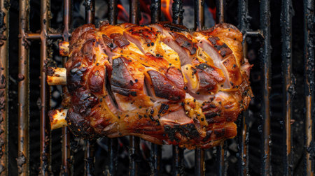 Barbecued suckling pig on a grill, top view, showcasing the crispy, caramelized skin. Ideal for promoting BBQ events and catering.