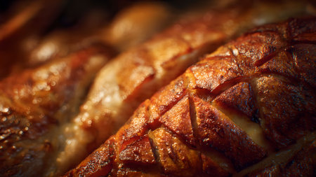 Close-up of roasted pork belly with crispy skin, showcasing the texture and golden-brown color. Food photography, delicious meal.