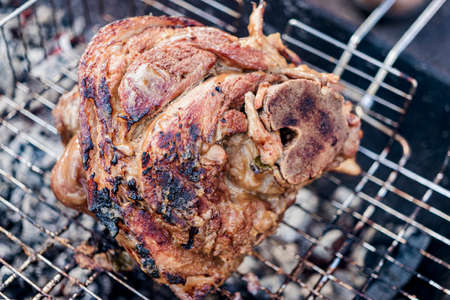 Grilled juicy pork knuckle. Appetizing knuckle or boar hoof. Cooking pork leg on coals. close-up. selective focus