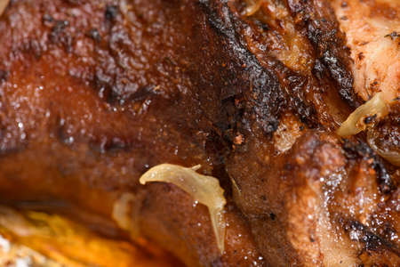 Roast pork knuckle with pepper and spices. Gray background. Top view. Copy space.