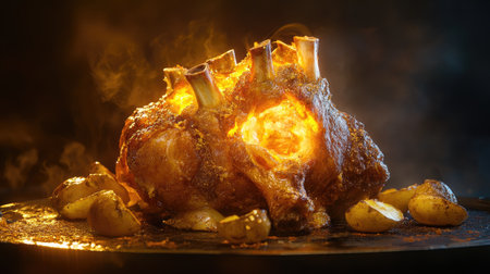 A stunning roasted meat dish, featuring a crispy exterior and infused with herbs, paired with golden roasted potatoes, perfect for festive gatherings.