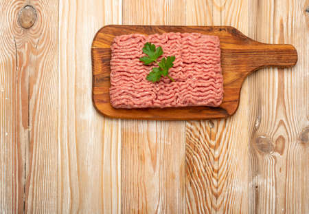 Turkey minced meat. Ground fillet on wood background, uncooked turkey mincemeat, raw forcemeat, fresh farce meat portion with greens