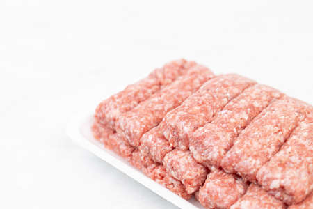 Raw minced meat in plastic packaging over white texture backdround. Top view, flat lay. Copy space