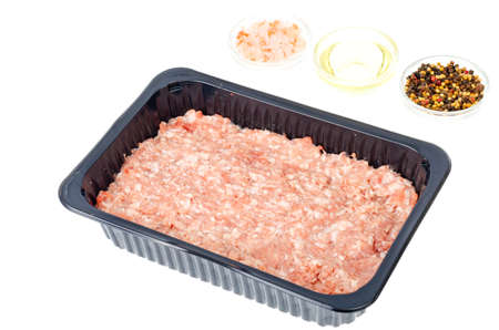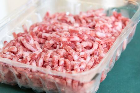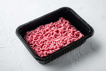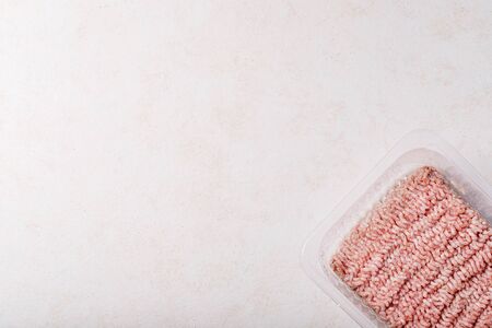 Fresh minced meat in plastic box packaging tray set, on white stone background