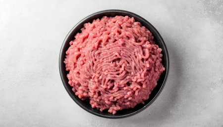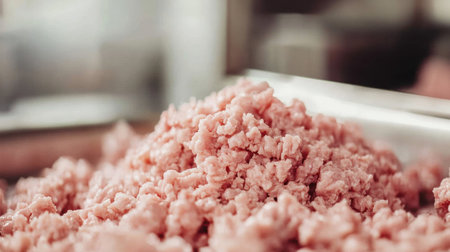 A close-up image of freshly ground pink meat showcasing its fine texture, ideal for culinary dishes, meal preparation, and various recipes.