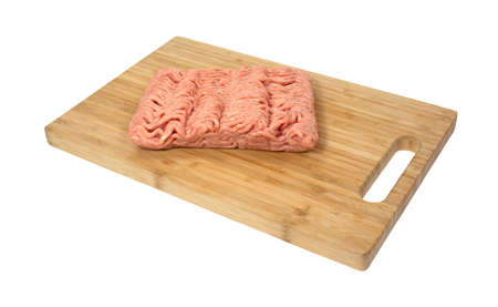 Turkey or chicken mince raw meat in a kitchen tray. Wooden background. Top View