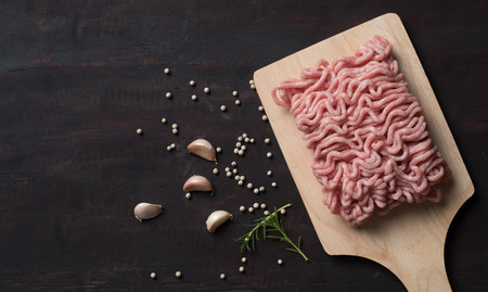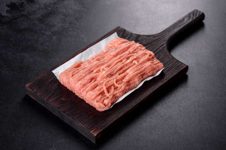 Fresh raw chicken mince on a dark wooden cutting board. Preparation for preparation of cutlets
