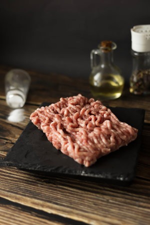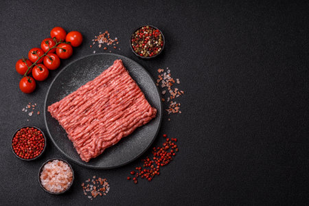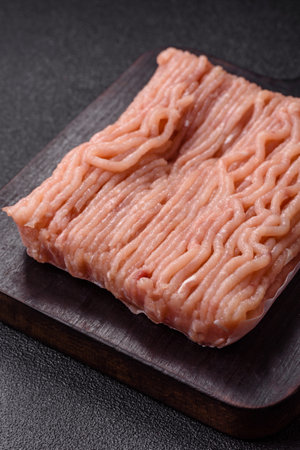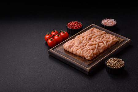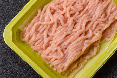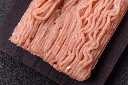 Raw minced chicken with salt, spices and herbs on a dark concrete background