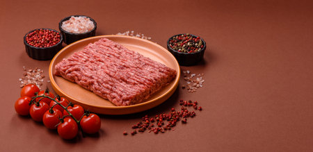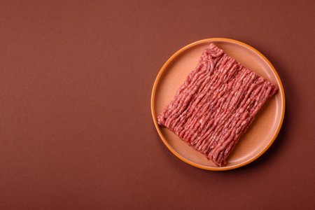 Raw ground beef or pork for burgers or meatballs with salt and spices. Raw ground beef as a food background for your design