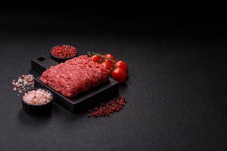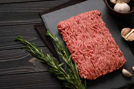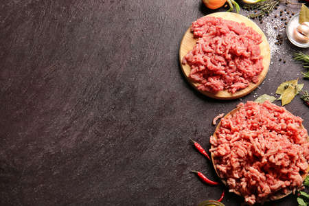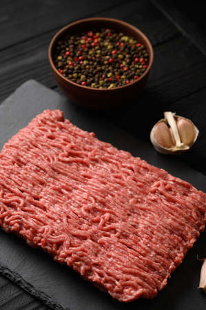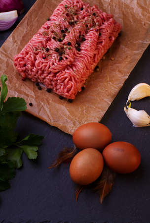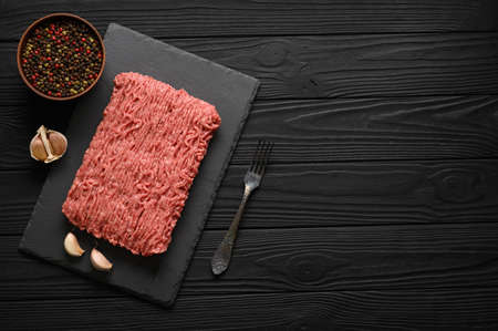 Fresh raw beef mince on a dark background. Preparation for cooking of cutlets