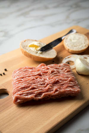 Fresh raw minced beef on backing paper and cutting board and ingredients