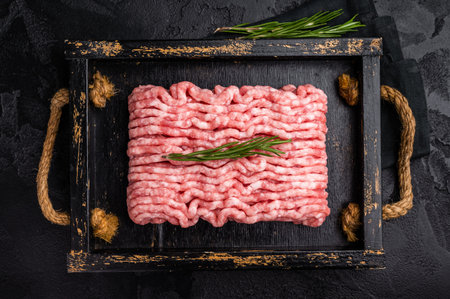 Fresh minced pork meat, raw mincemeat in wooden tray. black background. top view.