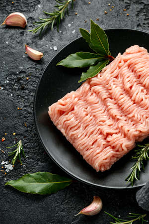 Raw Turkey breast fillets minced meat on black plate ready to cook