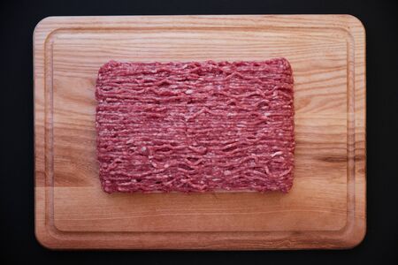 Raw mincemeat, farce meat portion on a wooden board on a black background