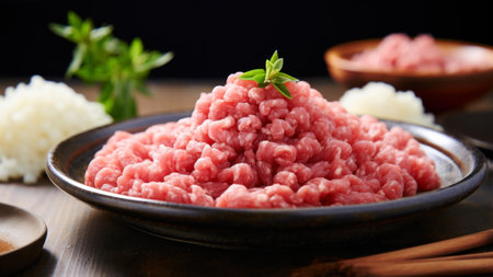 food background. Raw ground beef ready to be cooked on a plate. Generative AI