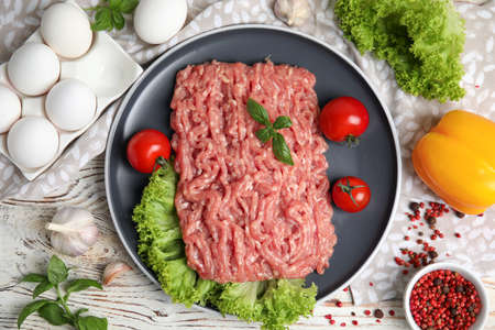 Raw chicken minced meat and ingredients on white wooden table, flat lay