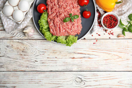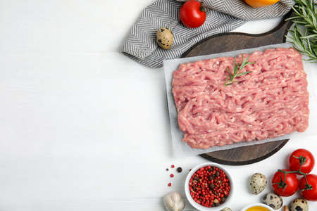 Raw chicken minced meat and ingredients on white wooden table, flat lay. Space for text