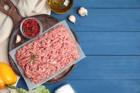 Raw chicken minced meat and ingredients on blue wooden table, flat lay. Space for text