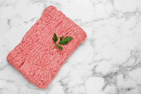 Raw fresh minced meat with parsley on white marble table, top view. Space for text