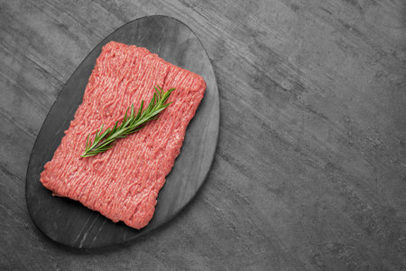 Raw fresh minced meat with rosemary on black wooden table, top view. Space for text