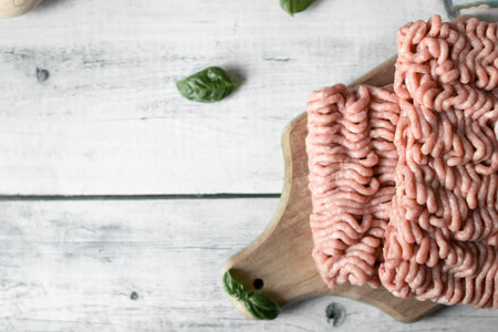 Turkey mince meat mockup. Ground fillet on wood background with copy space, uncooked turkey mincemeat flat lay, raw forcemeat, fresh farce meat portion with greens top view