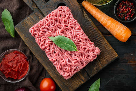 Classic italian bolognese sauce ingredients, ground meat tomatoe and herbs, on wooden cutting board, on old dark wooden table background, top view, flat lay