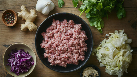 An artistic arrangement of gyoza ingredients, including ground pork, cabbage, and ginger, beautifully displayed on a rustic wooden table for an authentic cooking vibe.