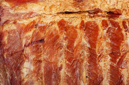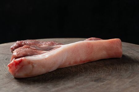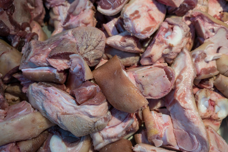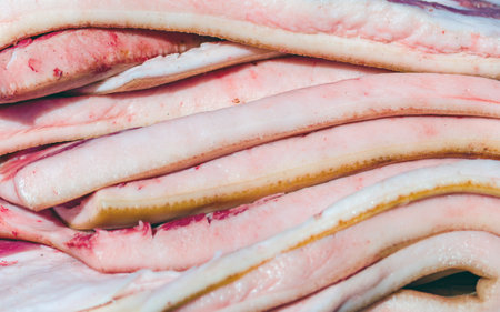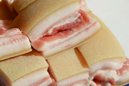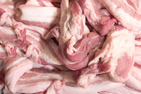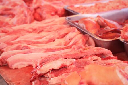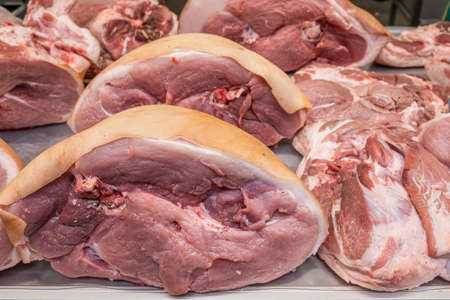 Raw pork leg and belly meat in wholesale store. Uncooked pork fat and skin for background.