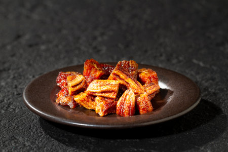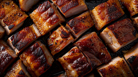 Crispy pork belly slices arranged beautifully on a black plate, showcasing their rich texture and golden-brown finish perfect for culinary creations.