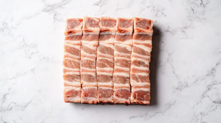 Beautifully arranged fresh pork belly slices on a smooth marble surface, perfect for culinary use or enticing food photography. Ideal for recipes.