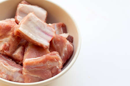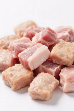A clean and minimalistic image featuring fresh, chopped raw pork pieces neatly arranged on a white plate, ideal for cooking enthusiasts and recipe creations.