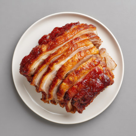 A beautifully presented crispy roasted pork belly on a white plate, showcasing its golden crackling and juicy meat. Perfect for culinary offerings.