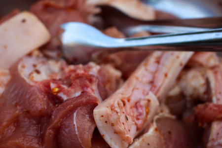 Pieces of raw meat lie in a steel bowl, ready to cook