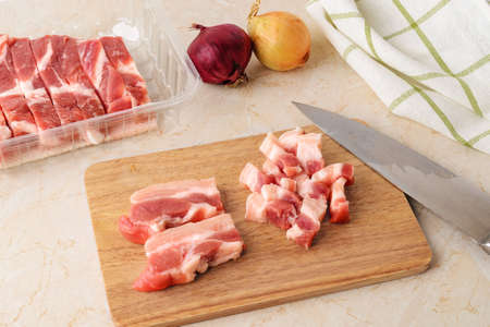 Cutting fresh raw pork belly into small pieces on a wood cutting board with a sharp knife over a kitchen table. Meat in a disposable transparent plastic food container. Cook at home. Top view.