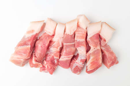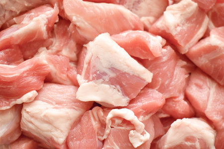 Raw pork meat. Fresh meat cubes. Diced pork.
