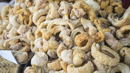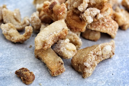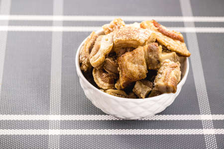Crackling bowl, Brazilian appetizer made by frying bacon, leather or meat and lots of fat, taken from the pork belly, Copy Space