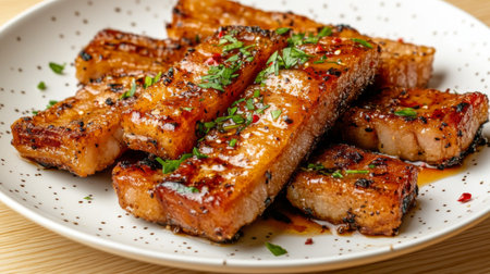 This appetizing image showcases perfectly cooked pork belly, featuring crispy skin and a rustic presentation, ideal for culinary inspiration.