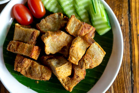 Pork belly fried on a plate with cucumber and tomatoes on a wooden table
