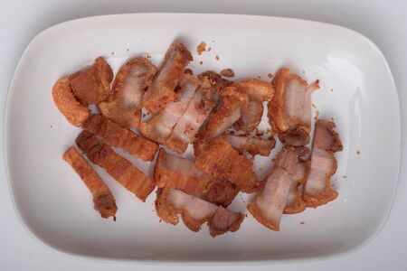 Crispy pork belly or deep fried pork on red dish. selective focus