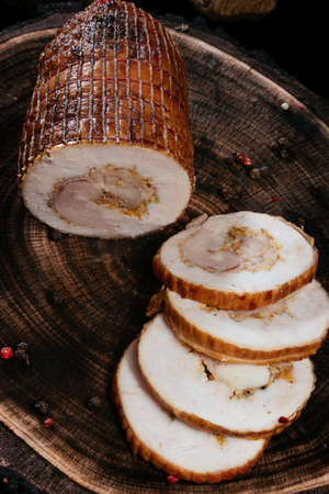 Freshly smoked piece of pork dog, sliced, laid out on a wooden background with oak stump. Close-up. High quality photo