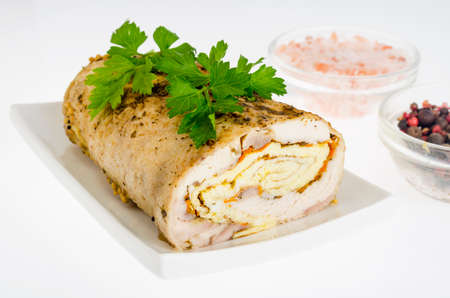Chicken meat rolls with egg pancakes and carrots. Studio Photo