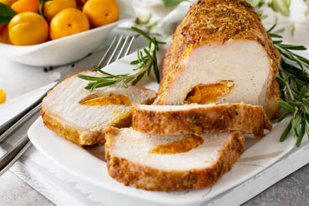 Meat roll (roulade) with with apricot stuffing and spices on a light stone or slate background. Thanksgiving day appetizer.