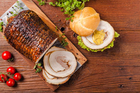 Roasted whole, stuffed with minced pork neck. Top view. Natural wooden background.