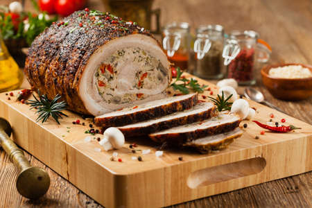 Roasted pork roll stuffed with mushrooms and cheese served with vegetables on a wooden board