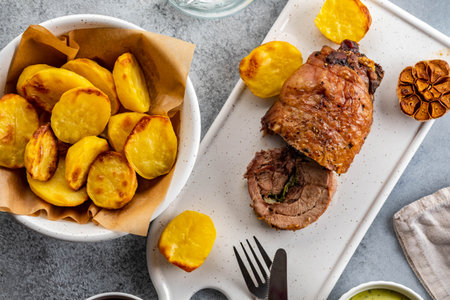 Meat roll (roulade) with with apricot stuffing and spices on a light stone or slate background. Thanksgiving day appetizer. Top view flat lay background, copy space.