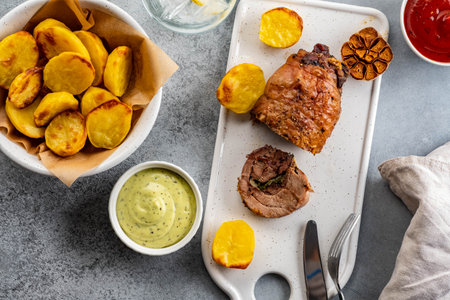 grilled beef steak and potatoes on plate isolated on white background, top view